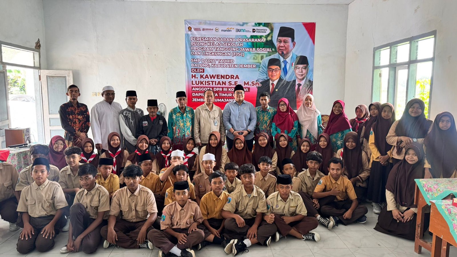 Towa News, Jember - Anggota DPR RI F-Gerindra, Kawendra Lukistian meresmikan dua ruang kelas baru di Kabupaten Jember, Kamis (9/10/25). Peresmian dilakukan di dua lokasi sekolah berbeda, yakni SMP Darut Tauhid, Balung Lor dan MI Nurul Hidayah, Sumber Kejayan, Mayang. Dalam sambutannya, Kawendra menyampaikan bahwa pembangunan ruang kelas baru merupakan wujud nyata meningkatkan kualitas sarana belajar bagi generasi muda.