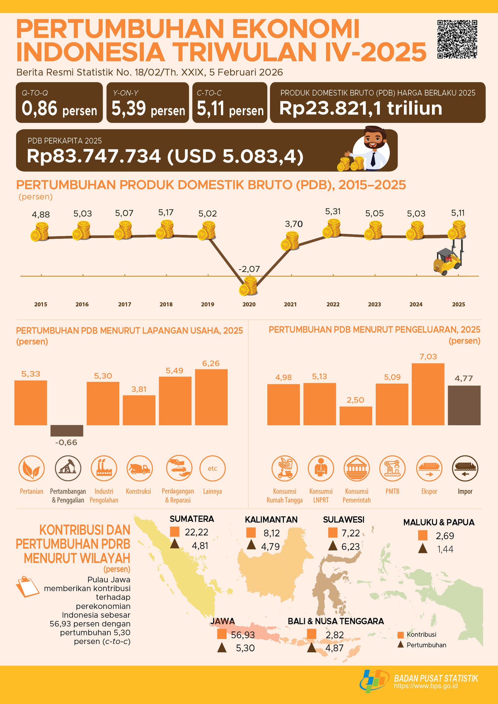 Pada triwulan IV-2025, ekonomi Indonesia tumbuh 5,39 persen secara tahunan (year-on-year) dibandingkan periode yang sama tahun sebelumnya. Lapangan usaha transportasi dan pergudangan memimpin dengan pertumbuhan 8,98 persen, sementara Pembentukan Modal Tetap Bruto (PMTB) tumbuh 6,12 persen.