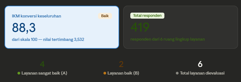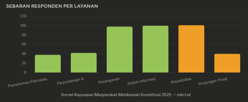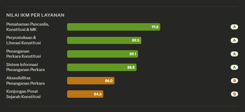 Dari enam layanan yang dievaluasi, Pemahaman Masyarakat terhadap Pancasila, Konstitusi, dan Mahkamah Konstitusi mencatat nilai tertinggi dengan IKM konversi 91,776, disusul Layanan Perpustakaan dan Literasi Konstitusi (89,461) serta Layanan Penanganan Perkara Konstitusi (89,097). Adapun Kunjungan Pusat Sejarah Konstitusi (Puskon) mencatat nilai terendah dengan IKM konversi 84,597 dan berada di kategori "Baik".